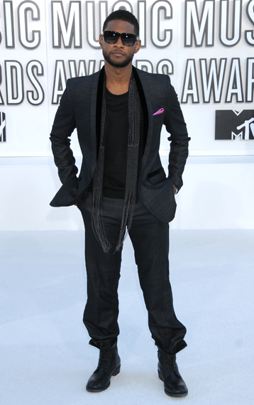 The last look that I chose to discuss was Usher in an all black ensemble. This outfit was very clean, crisp and classic. To start the outfit off, he had on a black,casual suit jacket, accompanied by an all black crew neck t-shirt (simple, but fashion savvy), his pants were all black as well. What makes this outfit epic in my opinion are the black combat boots, they speak volume for this particular look. As far as accessories, Usher wore a black scarf to stabilize his look; and to add color to this all black rendezvous- a fuchsia pink handkerchief was featured in the right pocket of the suit jacket, lastly, the dark tinted sunglasses gave mystery to his outfit.